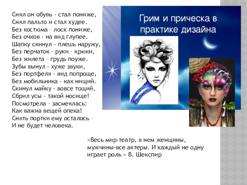 «Весь мир-театр, в нем женщины, мужчины-все актеры. И каждый не одну играет роль » В. Шекспир