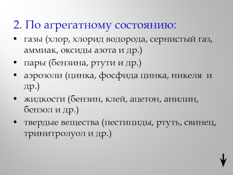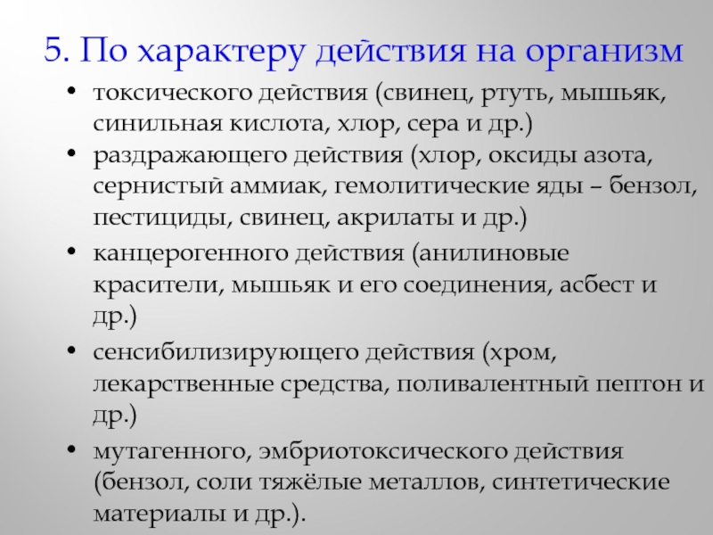 азота, сернистый аммиак, гемолитические яды – бензол, пестициды, свинец, акрилаты и др.)