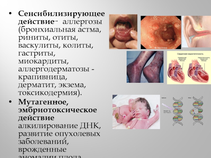 Слайд 9Сенсибилизирующее действие аллергозы (бронхиальная астма, риниты, отиты, васкулиты, колиты,