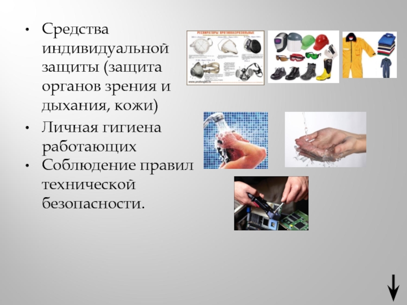 Слайд 13Средства индивидуальной защиты (защита органов зрения и дыхания, кожи)