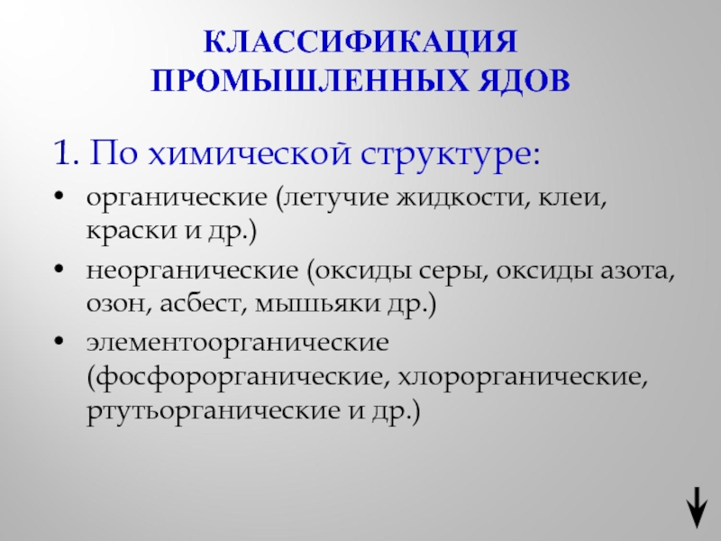 Слайд 4КЛАССИФИКАЦИЯ ПРОМЫШЛЕННЫХ ЯДОВ