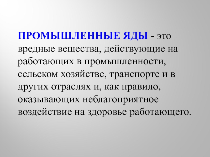 Слайд 2ПРОМЫШЛЕННЫЕ ЯДЫ - это вредные вещества, действующие на работающих в