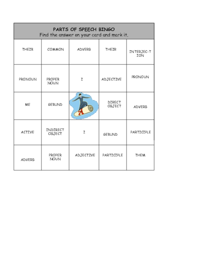 IPRONOUNDIRECT OBJECTGERUNDIACTIVEMEADJECTIVEINDIRECT OBJECTGERUNDPROPER NOUNCOMMONTHEIRADVERBTHEIRPRONOUNADVERBPARTICIPLEINTERJEC-TIONABSTRACTSHEWEMYPASSIVE