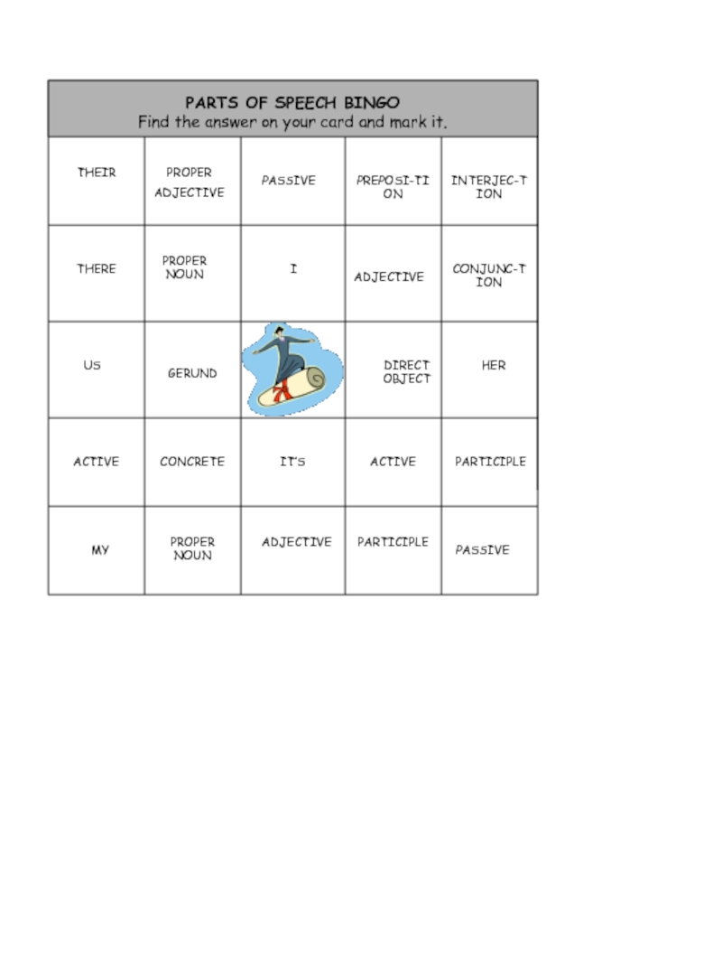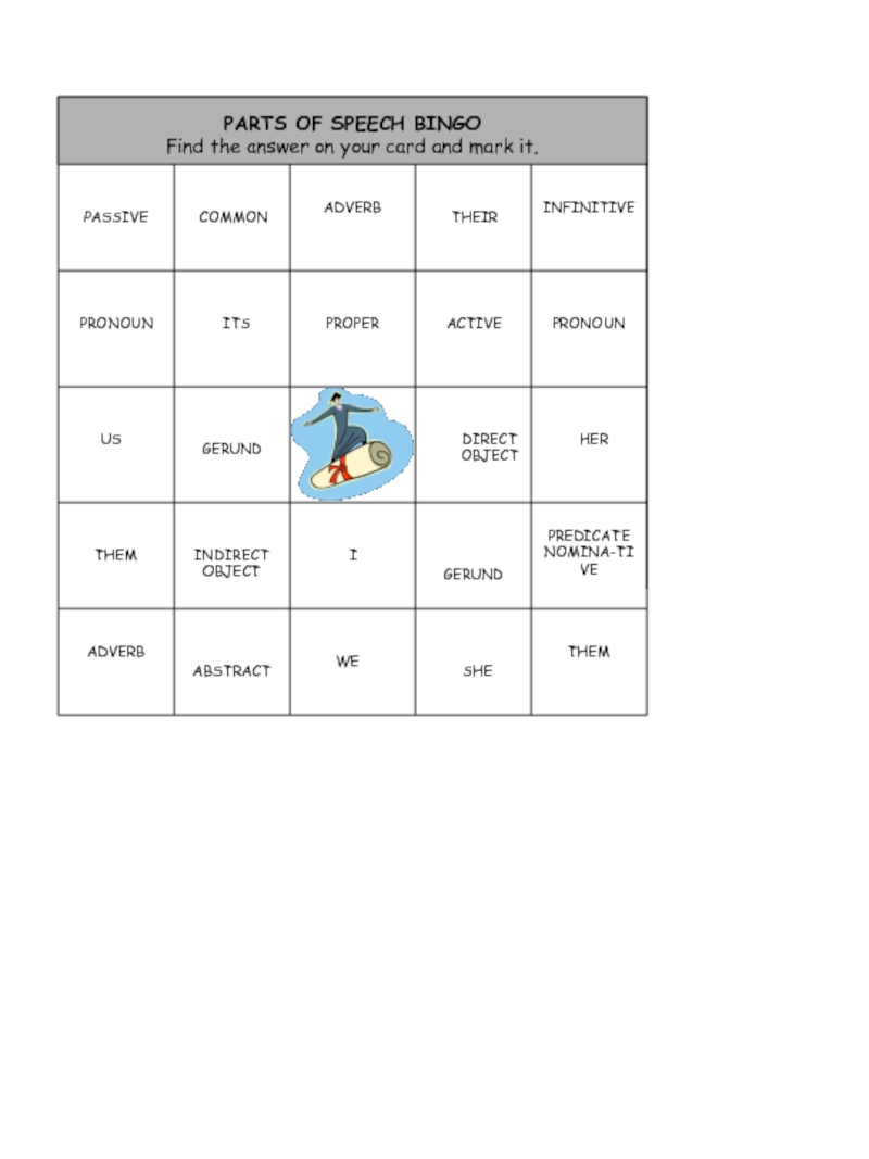 PROPERADJECTIVEPREPOSI-TIONPASSIVEITSIPRONOUNTHEIRDIRECT OBJECTTHEMHERPROPER NOUNCONJUNC-TIONPREDICATE NOMINA-TIVEGERUNDPARTICIPLEIADJECTIVEACTIVEMEACTIVEINTERJEC-TIONADVERBADJECTIVEINDIRECT OBJECT