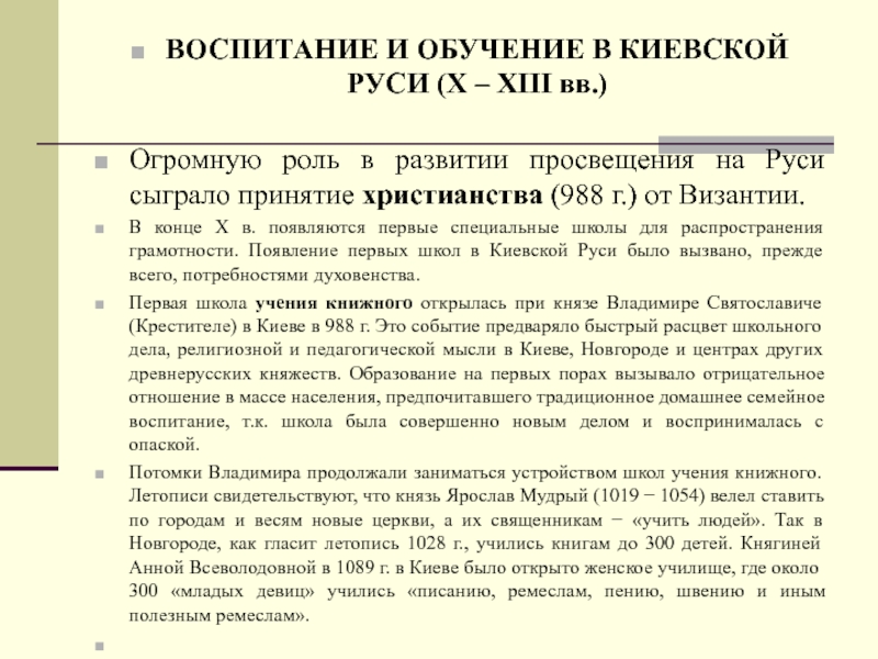 Первая школа учения книжного открылась при князе Владимире Святославиче (Крестителе) в Киеве в 988 г. Это событие предваряло быстрый расцвет школьного дела, религиозной и педагогической мысли в Киеве, Новгороде и центрах других древнерусских княжеств. Образование на первых порах вызывало отрицательное отношение в массе населения, предпочитавшего традиционное домашнее семейное воспитание, т.к. школа была совершенно новым делом и воспринималась с опаской.