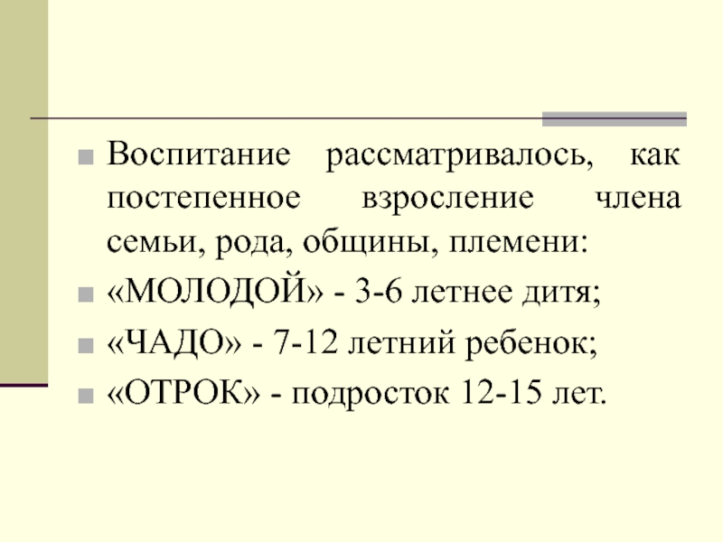 Слайд 7Воспитание рассматривалось, как постепенное взросление члена семьи, рода, общины, племени: