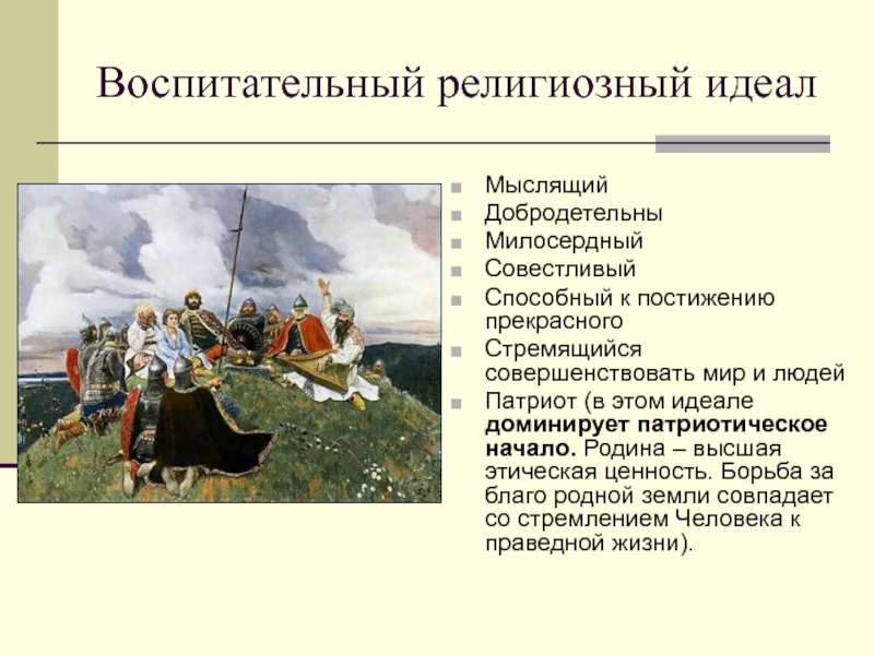 (в этом идеале доминирует патриотическое начало. Родина – высшая этическая