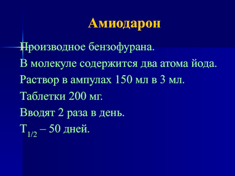 АмиодаронПроизводное бензофурана.В молекуле содержится два атома йода.Раствор в ампулах 150 мл в 3 мл.Таблетки 200 мг.Вводят 2