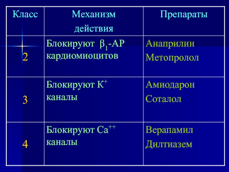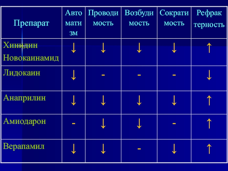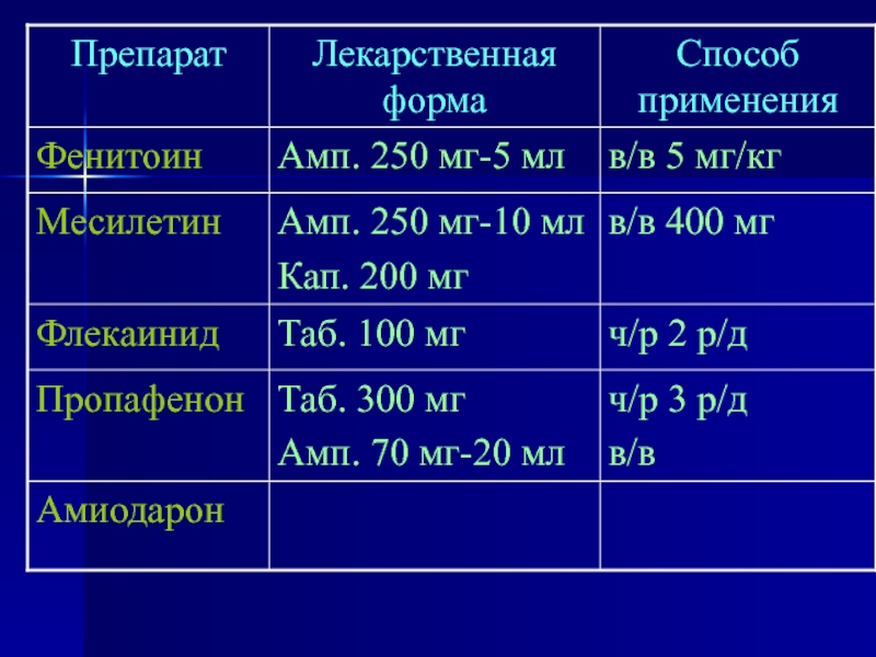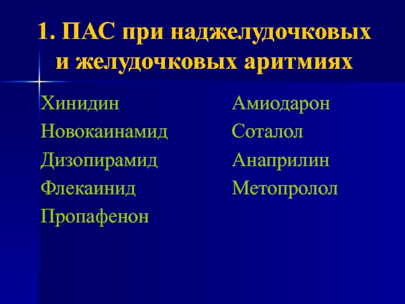1. ПАС при наджелудочковых и желудочковых аритмияхХинидинНовокаинамидДизопирамидФлекаинидПропафенонАмиодаронСоталолАнаприлинМетопролол