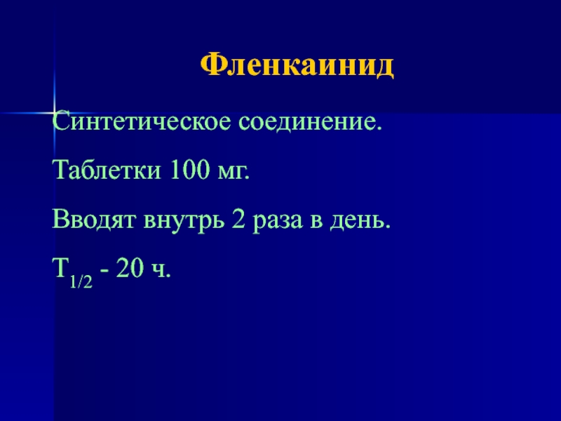 ФленкаинидСинтетическое соединение.Таблетки 100 мг.Вводят внутрь 2 раза в день.Т1/2 - 20 ч.