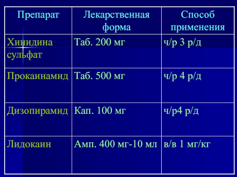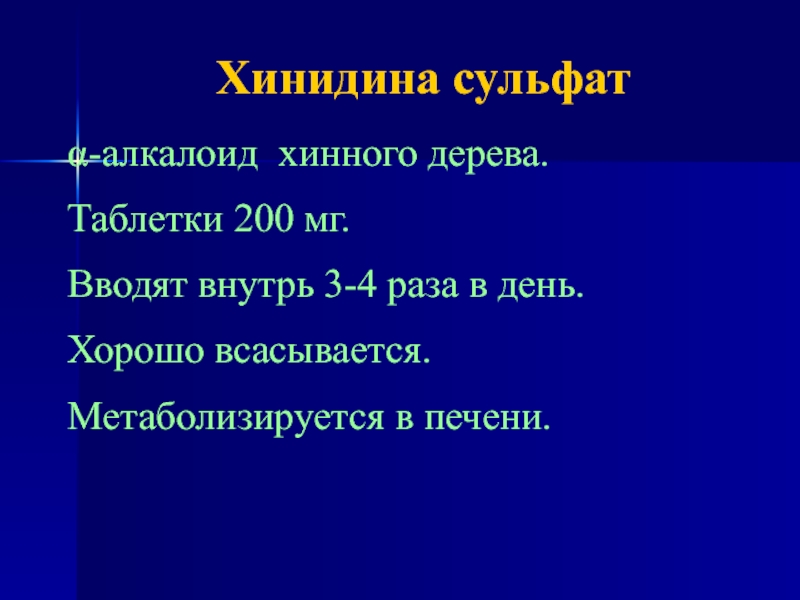 Хинидина сульфатα-алкалоид хинного дерева.Таблетки 200 мг.Вводят внутрь 3-4 раза в день.Хорошо всасывается.Метаболизируется в печени.