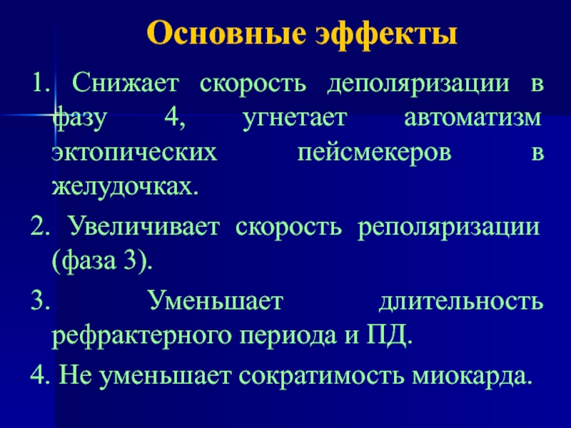 Основные эффекты1. Снижает скорость деполяризации в фазу 4, угнетает автоматизм эктопических пейсмекеров в желудочках.2. Увеличивает скорость реполяризации