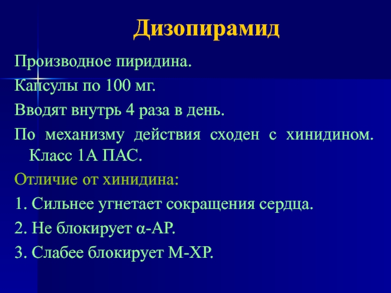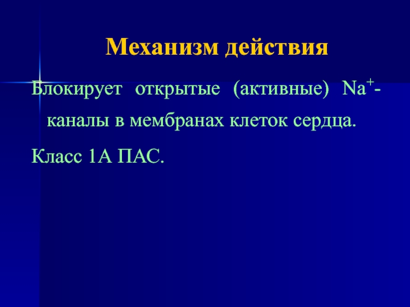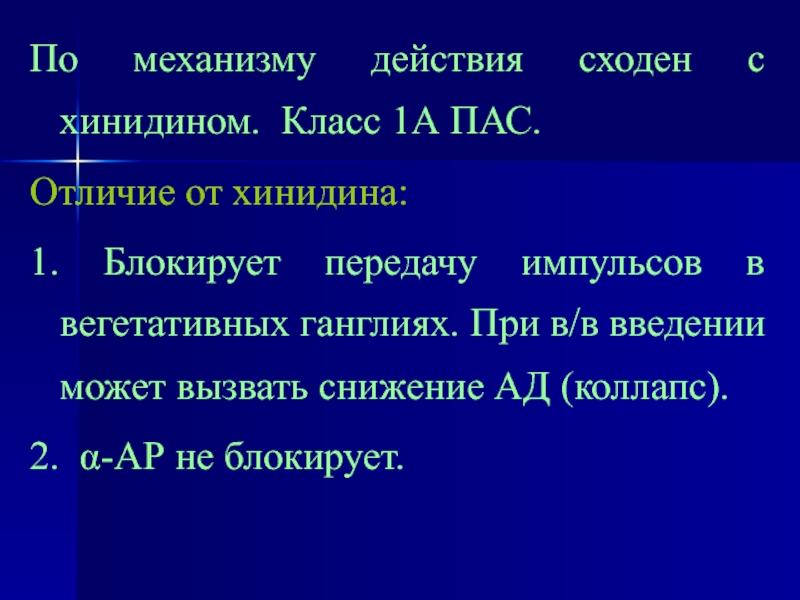 Слайд 26По механизму действия сходен с хинидином. Класс 1А ПАС.