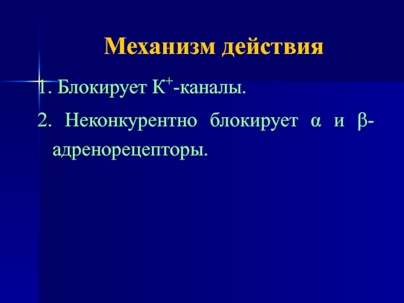 Механизм действия1. Блокирует К+-каналы.2. Неконкурентно блокирует α и β-адренорецепторы.
