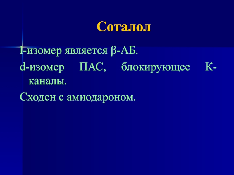 Соталолl-изомер является β-АБ.d-изомер ПАС, блокирующее К-каналы.Сходен с амиодароном.