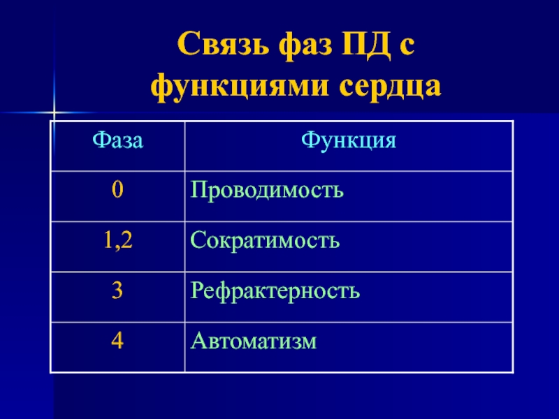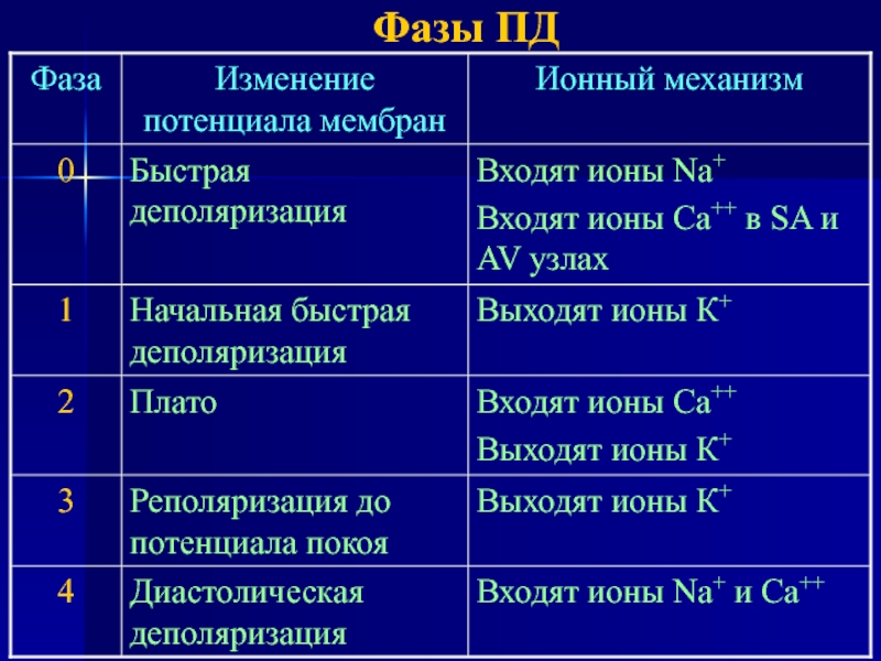Основные эффекты1. Увеличивает длительность реполяризации (фаза 3), длительность рефрактерного периода и ПД.2. Снижает автоматизм синусного узла и