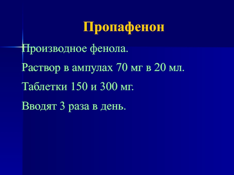 ПропафенонПроизводное фенола.Раствор в ампулах 70 мг в 20 мл.Таблетки 150 и 300 мг.Вводят 3 раза в день.