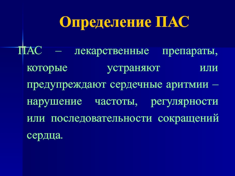 Определение ПАСПАС – лекарственные препараты, которые устраняют или предупреждают сердечные аритмии – нарушение частоты, регулярности или последовательности