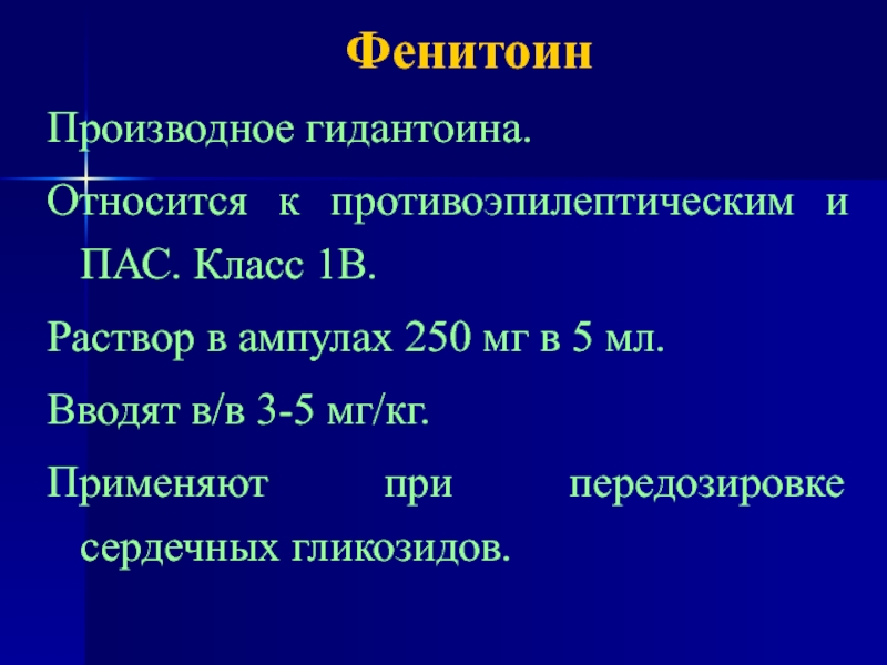 ФенитоинПроизводное гидантоина.Относится к противоэпилептическим и ПАС. Класс 1В.Раствор в ампулах 250 мг в 5 мл.Вводят в/в 3-5