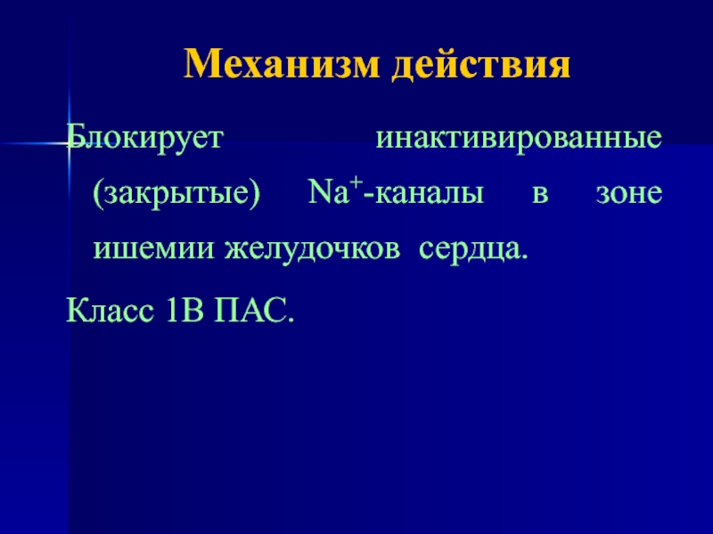 Механизм действияБлокирует инактивированные (закрытые) Na+-каналы в зоне ишемии желудочков сердца.Класс 1В ПАС.