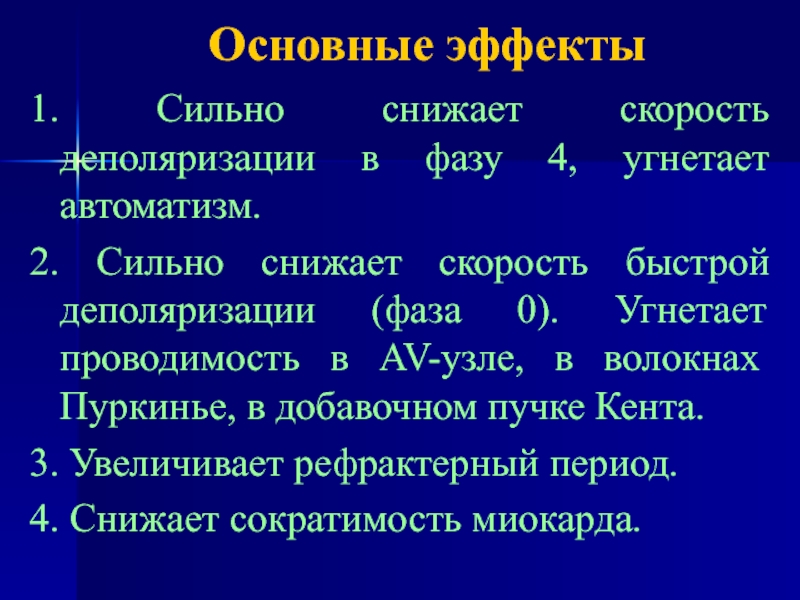 Основные эффекты1. Сильно снижает скорость деполяризации в фазу 4, угнетает автоматизм.2. Сильно снижает скорость быстрой деполяризации (фаза