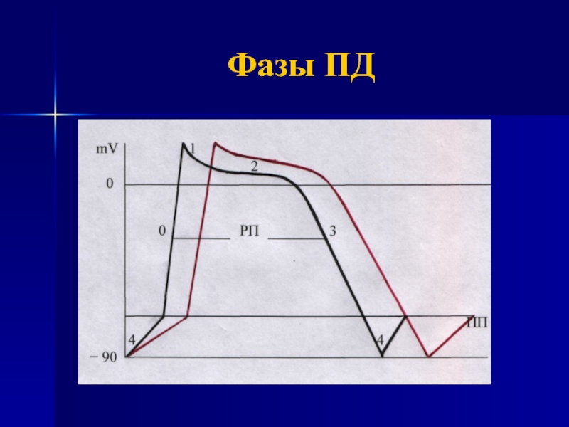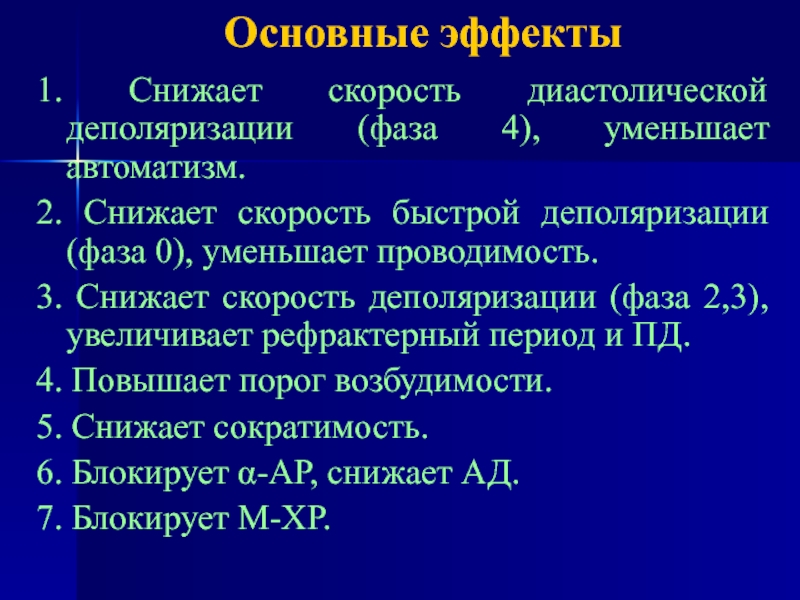 Основные эффекты1. Снижает скорость диастолической деполяризации (фаза 4), уменьшает автоматизм.2. Снижает скорость быстрой деполяризации (фаза 0), уменьшает