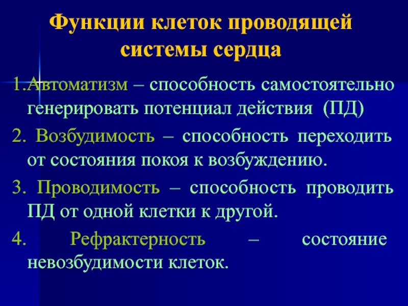 Функции клеток проводящей системы сердца 1.Автоматизм – способность самостоятельно генерировать потенциал действия (ПД)2. Возбудимость – способность переходить