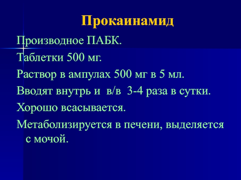 ПрокаинамидПроизводное ПАБК.Таблетки 500 мг.Раствор в ампулах 500 мг в 5 мл.Вводят внутрь и в/в 3-4 раза в