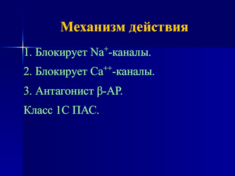 Механизм действия1. Блокирует Na+-каналы.2. Блокирует Са++-каналы.3. Антагонист β-АР.Класс 1С ПАС.