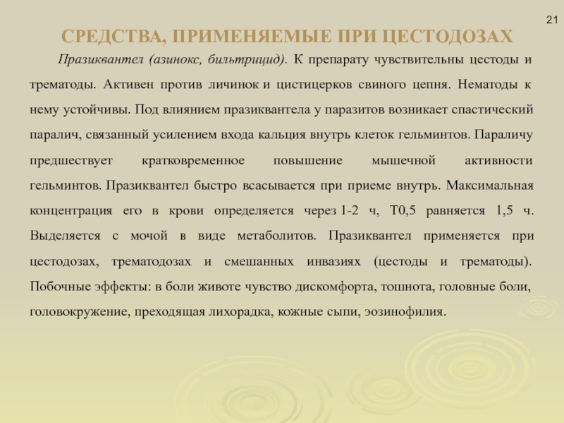 к нему устойчивы. Под влиянием празиквантела у паразитов возникает спастический паралич, связанный усилением входа кальция внутрь клеток гельминтов. Параличу предшествует кратковременное повышение мышечной активности гельминтов. Празиквантел быстро всасывается при приеме внутрь. Максимальная концентрация его в крови определяется через 1-2 ч, Т0,5 равняется 1,5 ч. Выделяется с мочой в виде метаболитов. Празиквантел применяется при цестодозах, трематодозах и смешанных инвазиях (цестоды и трематоды). Побочные эффекты: в боли животе чувство дискомфорта, тошнота, головные боли, головокружение, преходящая лихорадка, кожные сыпи, эозинофилия.
