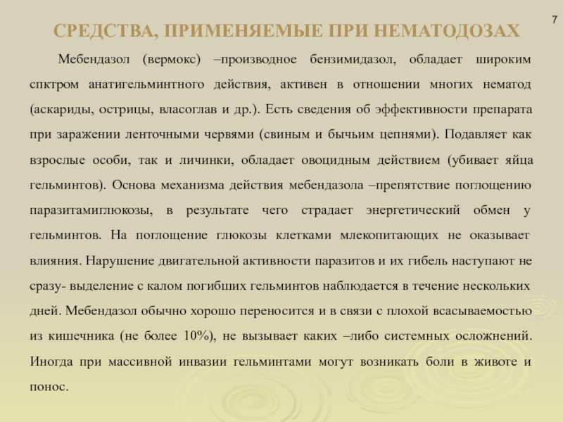 Слайд 7СРЕДСТВА, ПРИМЕНЯЕМЫЕ ПРИ НЕМАТОДОЗАХ