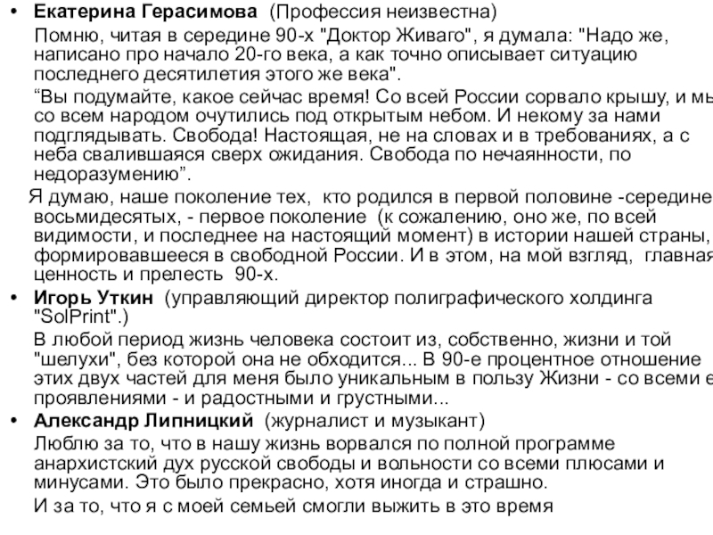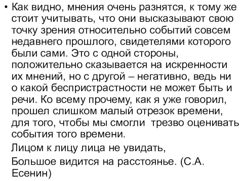 прошлого, свидетелями которого были сами. Это с одной стороны, положительно сказывается на искренности их мнений, но с другой – негативно, ведь ни о какой беспристрастности не может быть и речи. Ко всему прочему, как я уже говорил, прошел слишком малый отрезок времени, для того, чтобы мы смогли трезво оценивать события того времени.