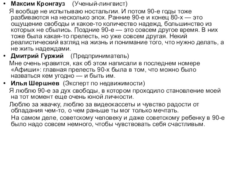 Я думаю, наше поколение тех, кто родился в первой половине -середине восьмидесятых, - первое поколение (к сожалению, оно же, по всей видимости, и последнее на настоящий момент) в истории нашей страны, формировавшееся в свободной России. И в этом, на мой взгляд, главная ценность и прелесть 90-х.