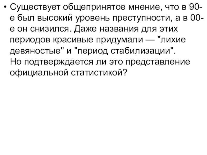 Слайд 8Существует общепринятое мнение, что в 90-е был высокий уровень преступности,