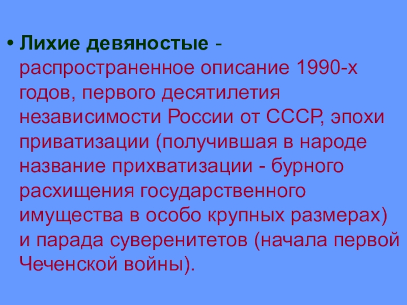 бурного расхищения государственного имущества в особо крупных размерах) и парада суверенитетов (начала первой Чеченской войны).