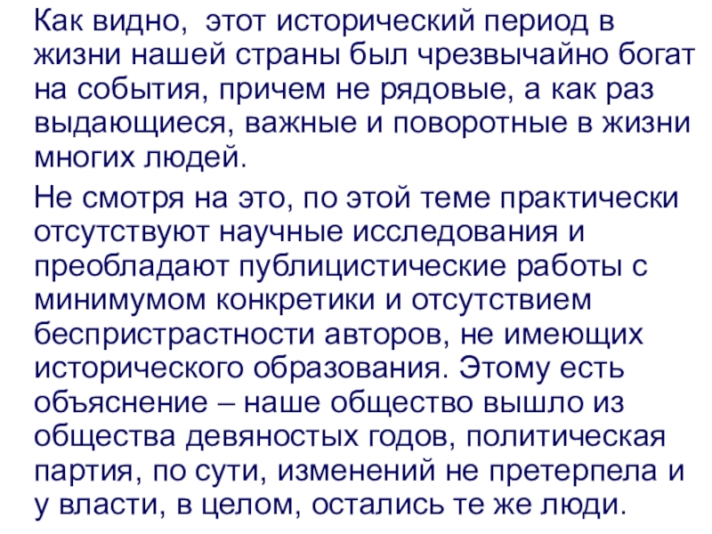 Не смотря на это, по этой теме практически отсутствуют научные исследования и преобладают публицистические работы с минимумом конкретики и отсутствием беспристрастности авторов, не имеющих исторического образования. Этому есть объяснение – наше общество вышло из общества девяностых годов, политическая партия, по сути, изменений не претерпела и у власти, в целом, остались те же люди.