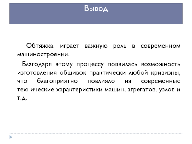 Вывод   Обтяжка, играет важную роль в современном машиностроении.  Благодаря этому процессу появилась возможность изготовления