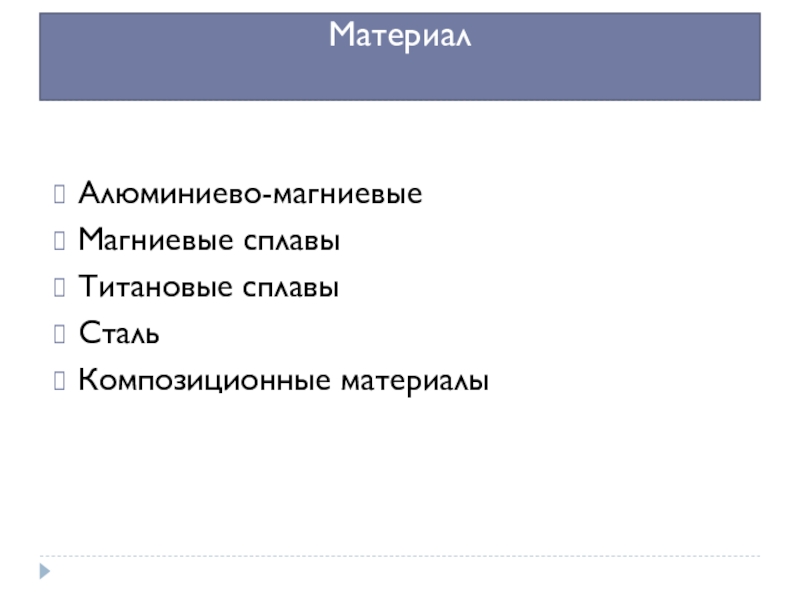 Материал Алюминиево-магниевыеМагниевые сплавыТитановые сплавыСтальКомпозиционные материалы
