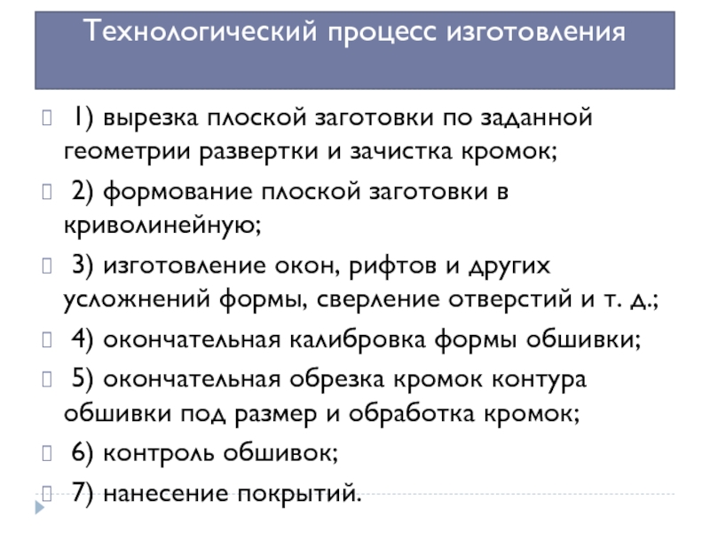 Технологический процесс изготовления  1) вырезка плоской заготовки по заданной геометрии развертки и зачистка кромок; 2) формование