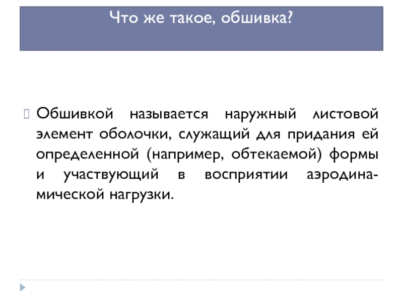 Что же такое, обшивка? Обшивкой называется наружный листовой элемент оболочки, служащий для придания ей определенной (например, обтекаемой) формы и участвующий в восприятии аэродина-мической нагрузки.