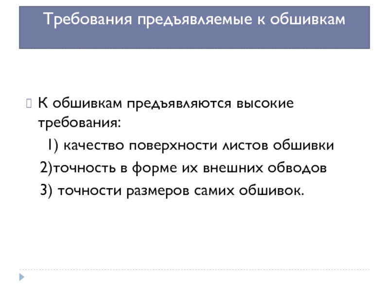 Требования предъявляемые к обшивкам К обшивкам предъявляются высокие требования: 	1) качество поверхности листов обшивки  2)точность в