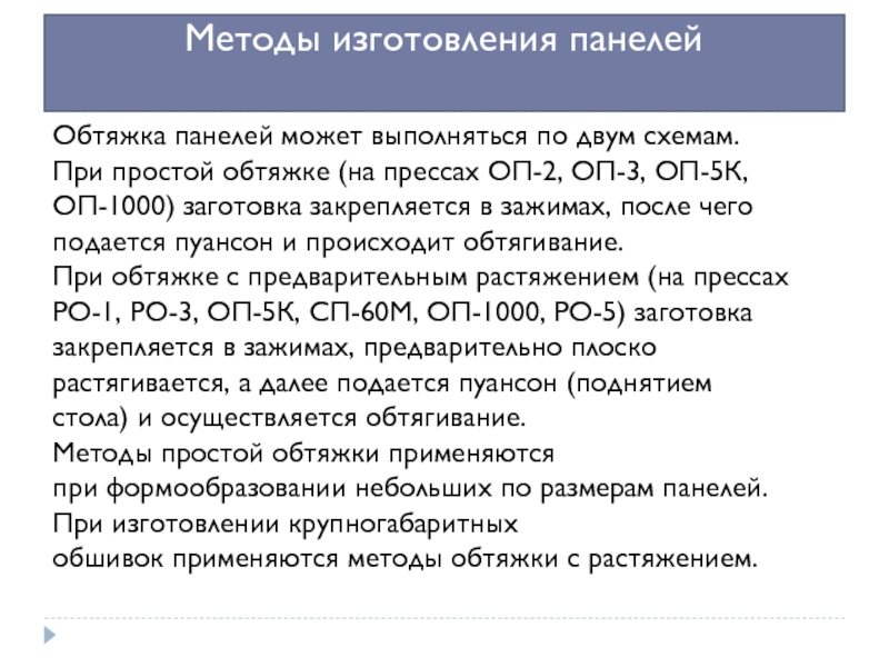 Методы изготовления панелей Обтяжка панелей может выполняться по двум схемам.При простой обтяжке (на прессах ОП-2, ОП-3, ОП-5К,ОП-1000)