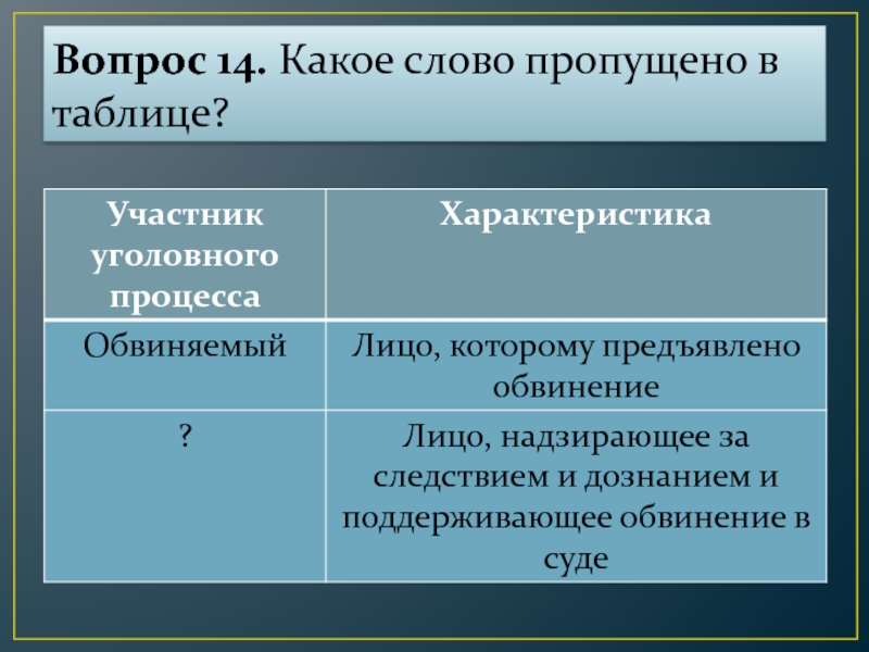 Слайд 36Вопрос 14. Какое слово пропущено в таблице?