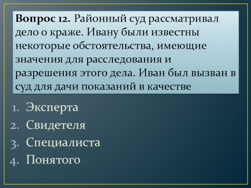 Слайд 34Вопрос 12. Районный суд рассматривал дело о краже. Ивану были