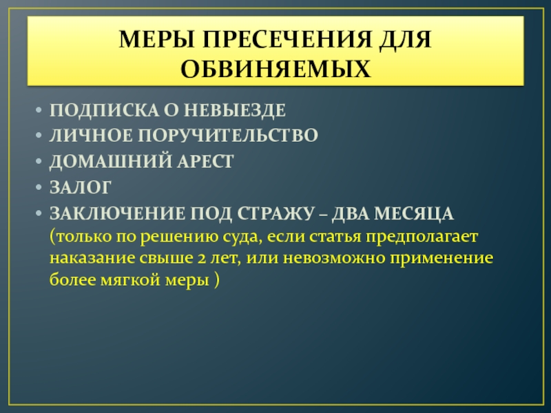 Слайд 12МЕРЫ ПРЕСЕЧЕНИЯ ДЛЯ ОБВИНЯЕМЫХ