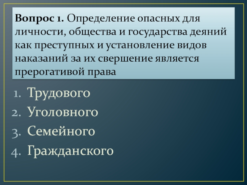 Слайд 23Вопрос 1. Определение опасных для личности, общества и государства деяний