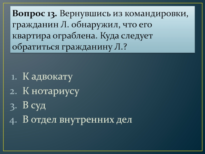 Слайд 35Вопрос 13. Вернувшись из командировки, гражданин Л. обнаружил, что его
