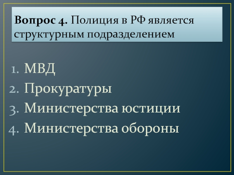 Слайд 26Вопрос 4. Полиция в РФ является структурным подразделением