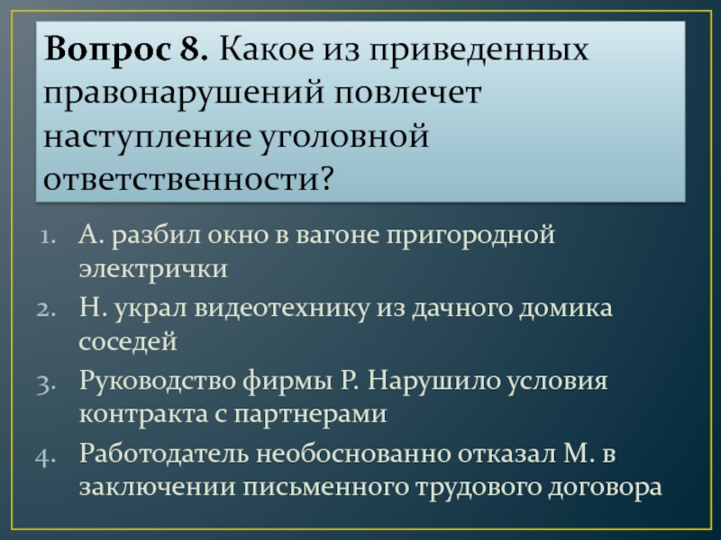 Слайд 30Вопрос 8. Какое из приведенных правонарушений повлечет наступление уголовной ответственности?