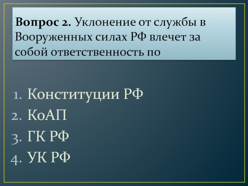 Слайд 24Вопрос 2. Уклонение от службы в Вооруженных силах РФ влечет